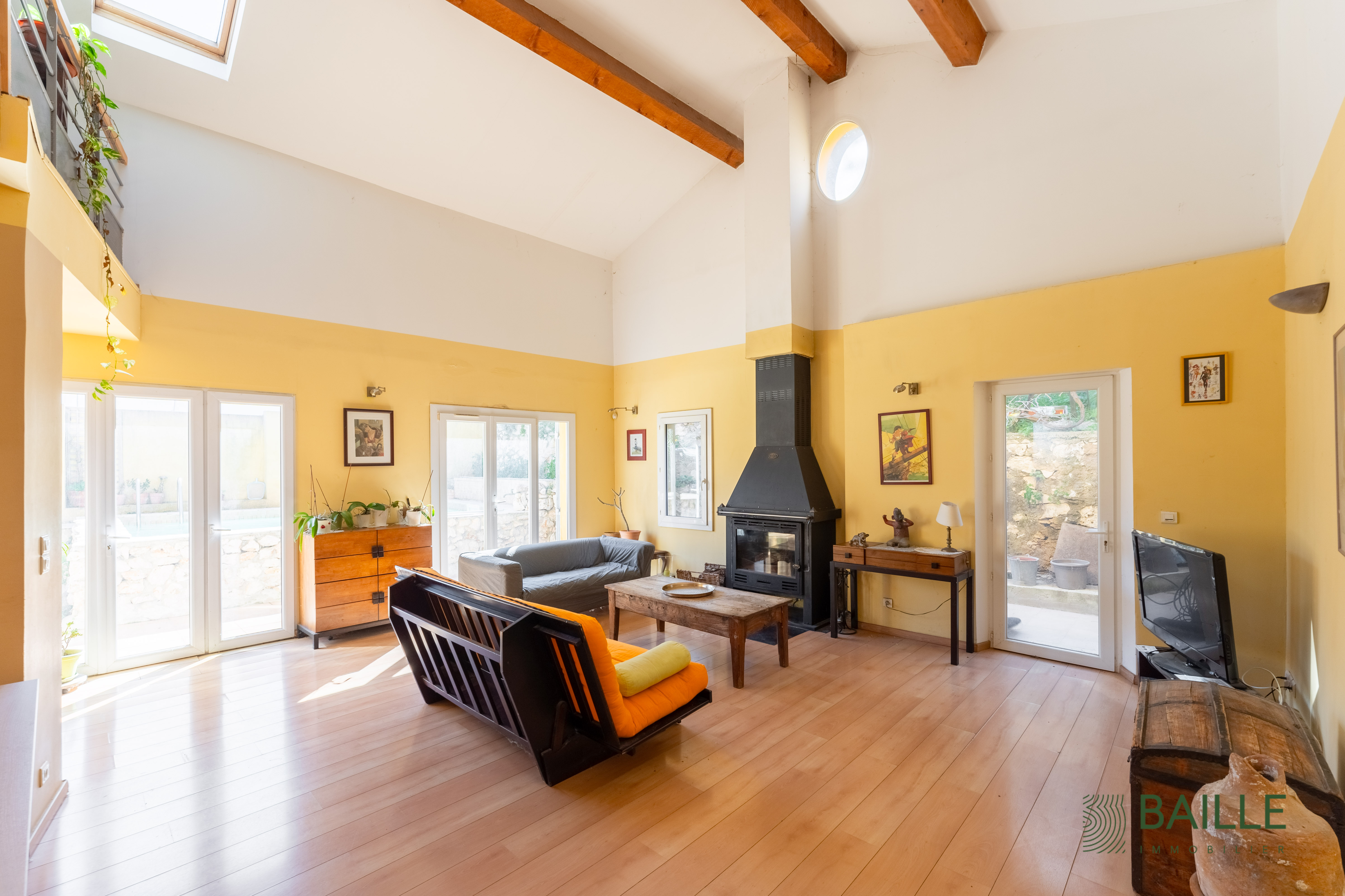 Le séjour et la cuisine s'ouvrent par 3 baies vitrées sur la terrasse dotée d'une piscine au pied du jardin arboré en restanques.